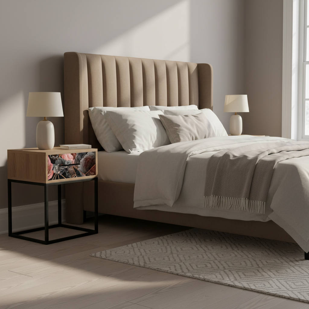 Single drawer Bedside pedestal table with a trendy geometric rose pattern on the drawer front boxed in a beautiful solid oak case. Add a touch of elegance to your bedroom with this bedside table. The trendy geometric rose pattern on the front of the drawer and the beautiful solid oak case make it a true standout piece. With its single drawer, you can easily keep your bedside essentials organized and within reach.