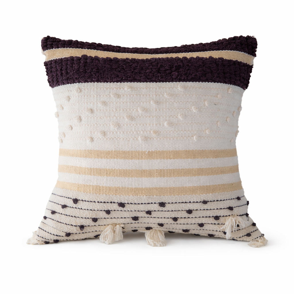 Bring warmth and effortless style into your home with this Textured Boho Scatter Cushion, designed to add depth, comfort, and visual interest to any space. Featuring a harmonious blend of soft neutrals and deep accent tones, this cushion is defined by its rich woven textures, subtle tuft detailing, and decorative tassels.